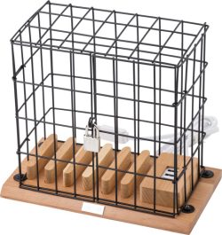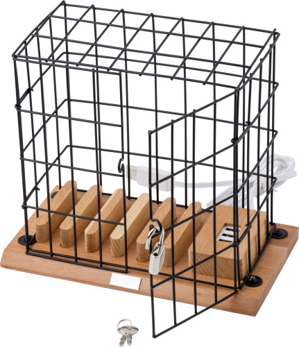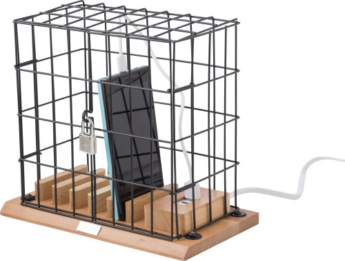 Kletka za držalo za telefon iz aluminija in lesa, vključno z USB priključki in ključavnico z dvema majhnima ključema.