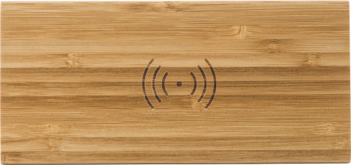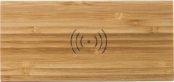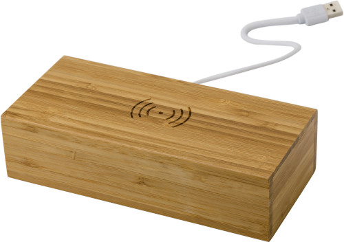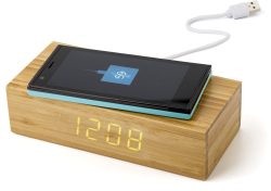 Brezžični polnilec iz bambusa 5 W, z vgrajenim LED zaslonom ure z belo svetlobo. Polnilec ima mikro USB priključek. Gumbi na dnu za nastavitev časa. Vključno s kablom in baterijami.