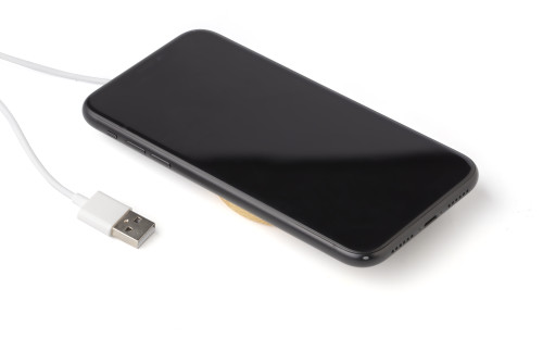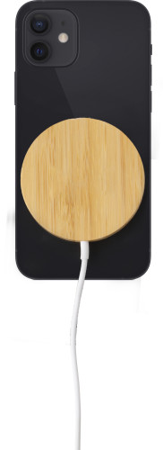 Brezžični polnilec iz bambusa in TPE. Vhod 9V=1,5A. Brezžična moč 10 vatov. Vključno s kablom. Posamezno pakirano v škatli iz kraft papirja.
