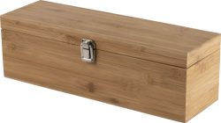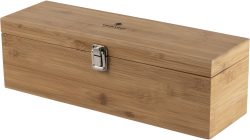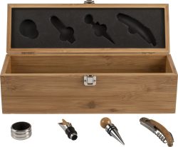 Darilni set za vino v bambusovi škatli. Predmeti so iz nerjavečega jekla z bambusovimi poudarki. Vključuje: obroček za steklenico vina, nastavek za točenje, zamašek in zamašek.