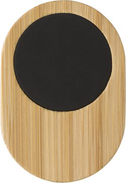 Držalo za telefon iz bambusa za uporabo v avtu, lahko ga pritrdite na ventilator. Z magnetno nalepko pa za pritrditev na telefon. Posamezno pakirano v rjavi kartonski škatli.