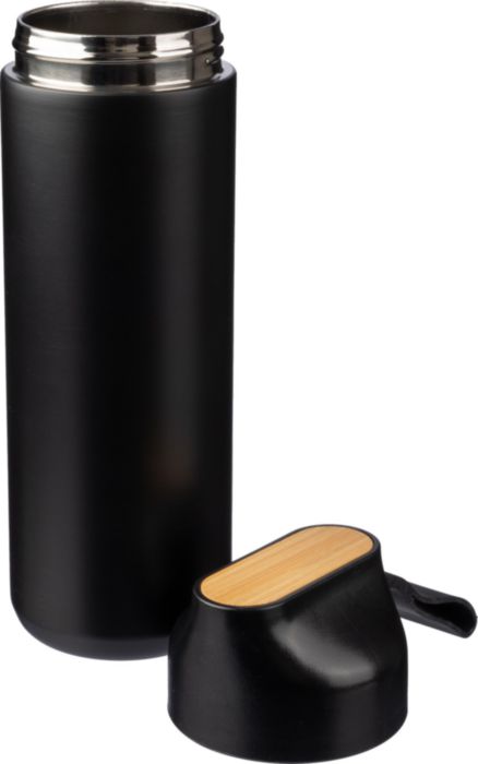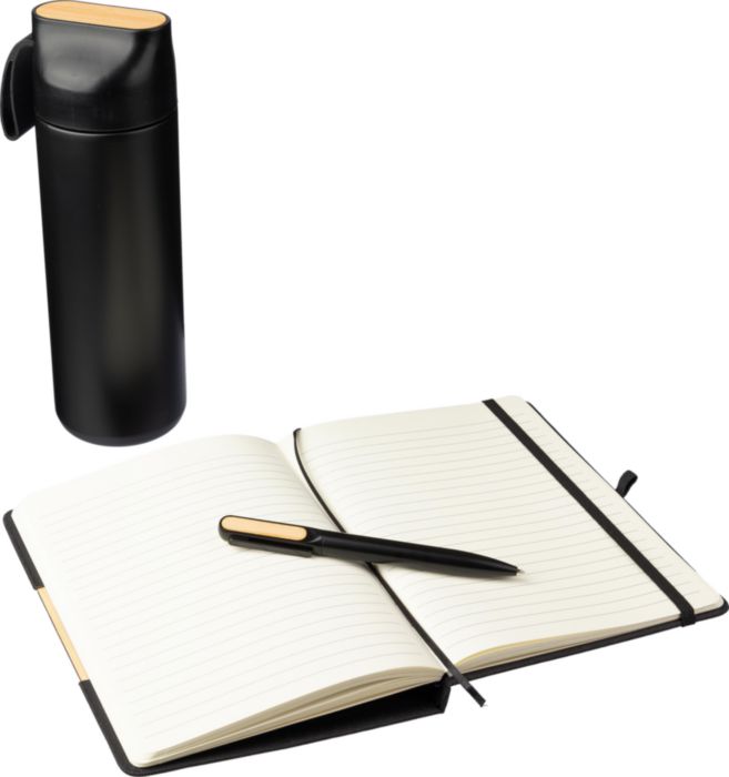 Darilna škatla iz črnega kartona, ki vsebuje 3 predmete: vakuumsko izolirano dvostensko steklenico za pitje iz nerjavečega jekla (640 ml) s silikonskim trakom in bambusovim detajlom na vrhu. Aluminijast kemični svinčnik z mat površino in bambusovim detajlom na sponki; ter beležka A5 z 80 črtastimi stranmi in zložljivim ovitkom, ki se spremeni v držalo za telefon, z bambusovim detajlom na ovitku.
