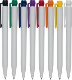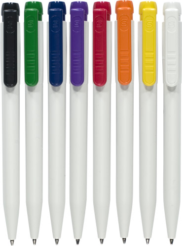 Plastični kemični svinčnik Stilolinea z belim tulcem, barvno široko sponko in jumbo polnilom. Modro črnilo. Priloženo nemškemu dokumentalnemu črnilu.