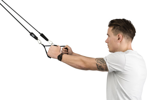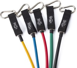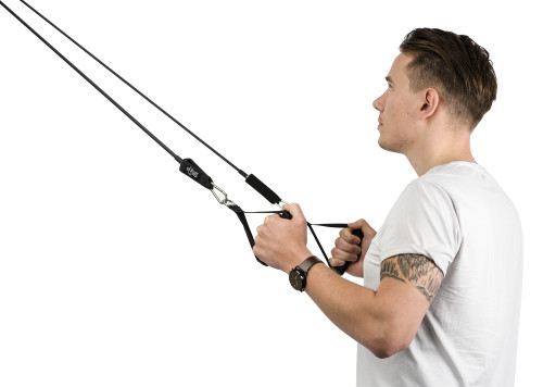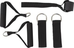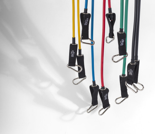 Fitnes komplet v torbi iz poliestra (210D). Vključuje pet fitnes elastik iz lateksa. vsak z drugačnim uporom. Za pritrditev ročajev ali nastavkov uporabite karabine na najlonskih (600D) trakovih.