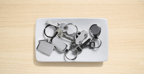 Držalo za ključe iz cinka. Pakirano v črno laminirano darilno škatlo.
