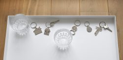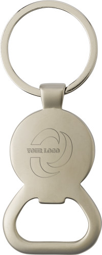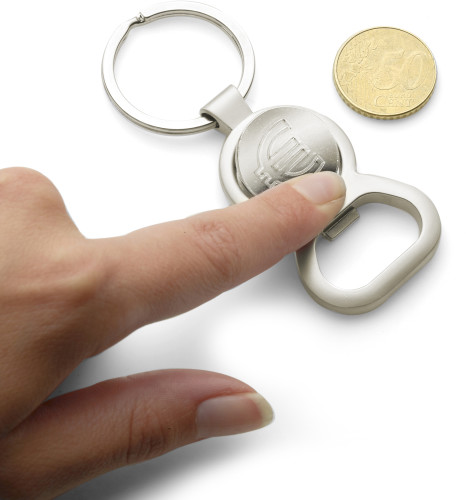 Kovinsko držalo za ključe z odpiračem za steklenice in vstavljenim magnetnim kovancem za nakupovalni voziček »euro«. Pakirano v darilni škatli.