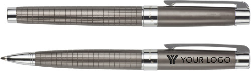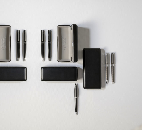 Komplet pisal Charles Dickens®, sestavljen iz sivega kovinskega kemičnega svinčnika in rolerja; predstavljen v luksuzni predstavitveni škatli. Črnilo.