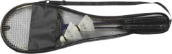 Kovinski set za badminton, sestavljen iz dveh loparjev z jeklenim okvirjem in plastičnimi ročaji, dveh žogic in črne mrežaste torbice z naramnico.