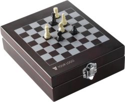 Vinski set v leseni darilni škatli s šahovsko partijo. Vključuje: zamašek za steklenice iz nerjavečega jekla, merilnik temperature, lovilec kapljanja in natakarski nož.