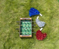 MDF namizna nogometna igra, samosestavljanje. S šestimi plastičnimi igralci na vsaki strani in žogo.