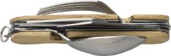 Multifunkcijski komplet jedilnega pribora iz bambusa (žlica, vilice, nož, odpirač za steklenice, manjši nož). Jedilni pribor lahko ločite za obe roki. Posamezno pakirano v rjavi kartonski škatli.