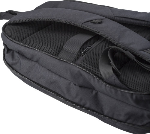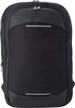 Nahrbtnik iz poliestra (600D) s sprednjim žepom na zadrgo in nastavljivimi oblazinjenimi naramnicami. S skrivnim žepom na zadnji strani in odsevnimi črtami na sprednji strani.
