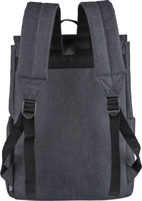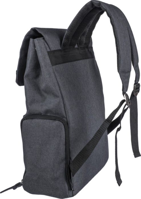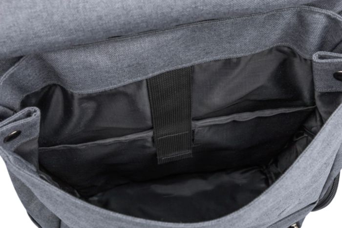 Nahrbtnik za prenosni računalnik (15 palcev) z detajli iz PVC-ja in podlogo. Ima majhen sprednji žep z zadrgo in karabinom za ključe, en stranski žep z zadrgo, en običajni stranski žep in velik žep z magnetnim zapiranjem in žepom za prenosnik. Nastavljivi obliznjeni naramnici.