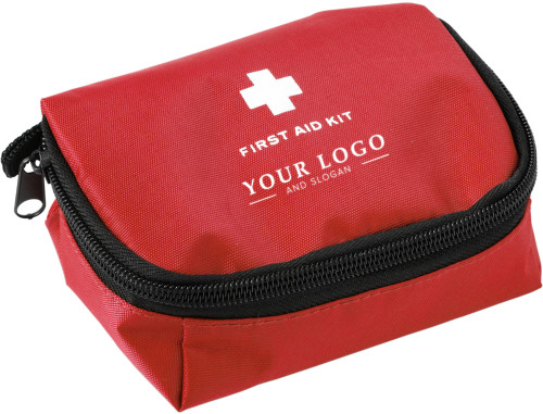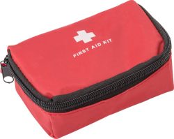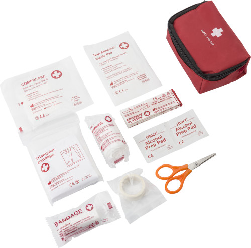 Komplet prve pomoči v najlonski torbici (600D). Vključuje: prožni povoj, zvitek povojev, par škarij, pripravljalno blazinico, alkoholno blazinico, blazinico, povoj z dvema varnostnima zatičema, pet povojev in zvitek gaze.