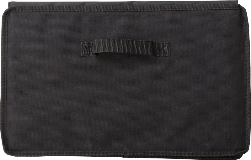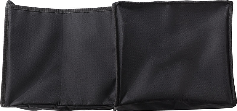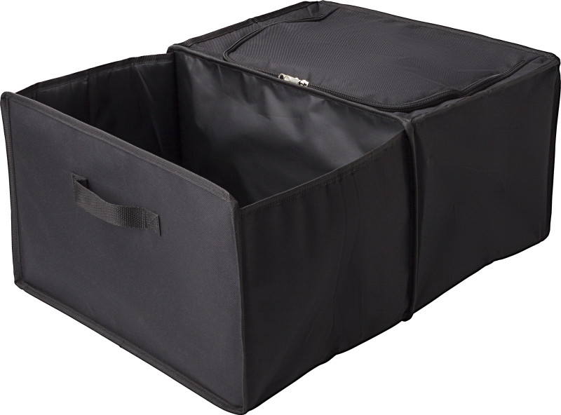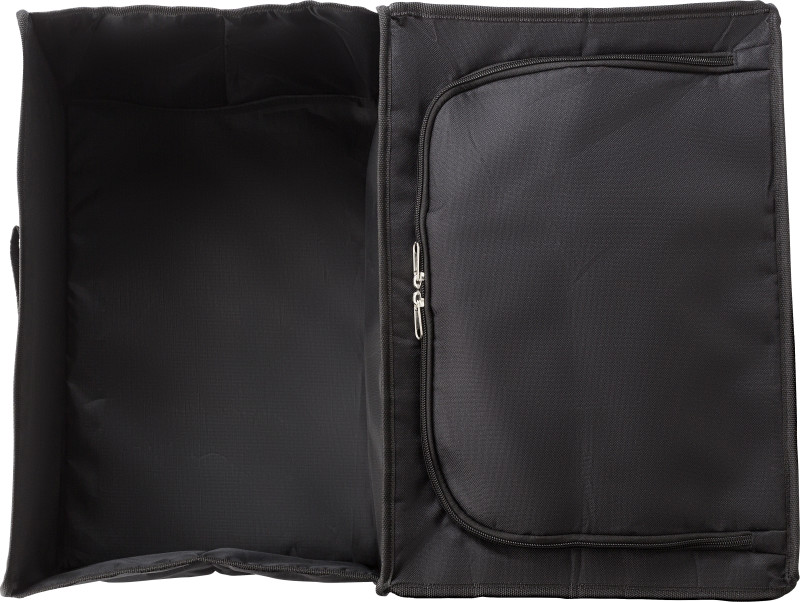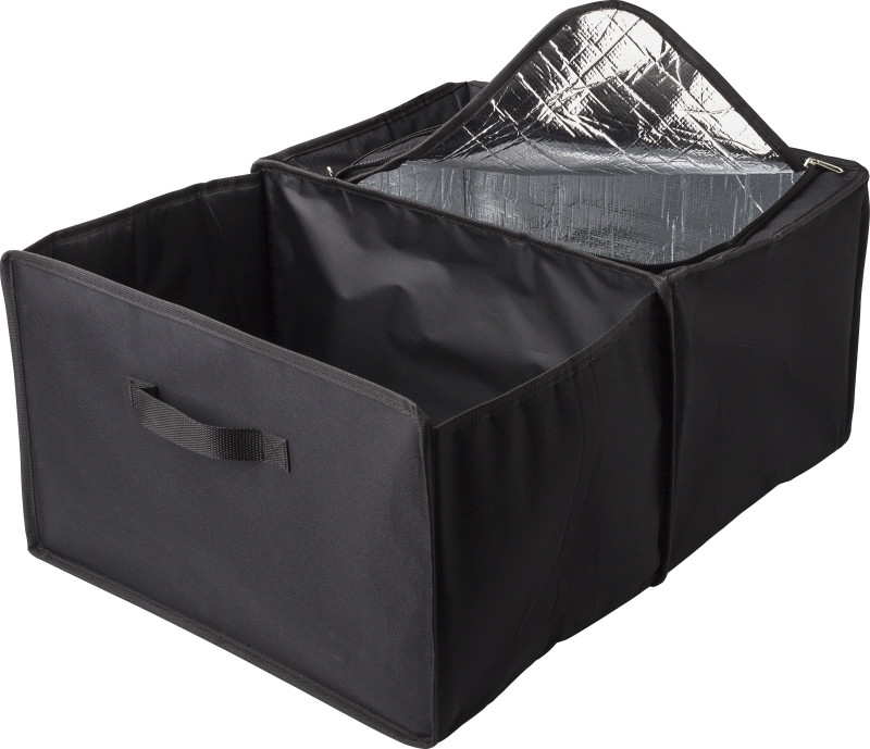 Organizator za avto iz poliestra. Dva predala, ena hladilna torba, ki se zapira na zadrgo z aluminijasto v notranjost . Zložljivo