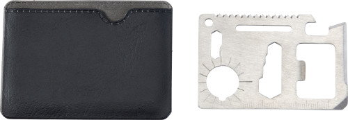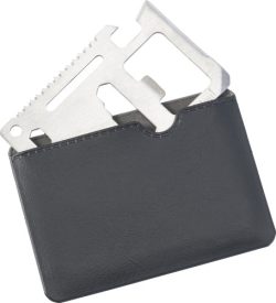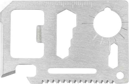 Večnamensko orodje iz nerjavečega jekla z 11 funkcijami. Funkcije vključujejo: nož, odpirač za pločevinke, metuljasto matico, žago, izvijač, odpirač za steklenice, ravnilo in ključe različnih velikosti. Pakirano v PU vrečki.