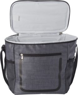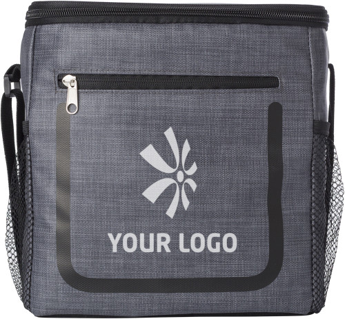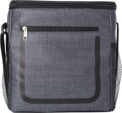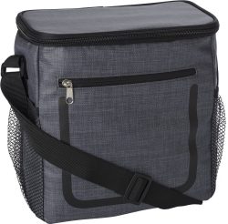 PU hladilna torba s sprednjim žepom z zadrgo in mrežastimi predelki na obeh straneh. Notranjost je obložena z belo hladilno folijo. Torba ima nastavljiv naramni pas.