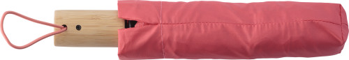RPET zložljiv dežnik z osmimi paneli, zapenjanjem na ježka in ročajem iz bambusa. Z gumbom za samodejno odpiranje in zapiranje. Vključno z rokavom.