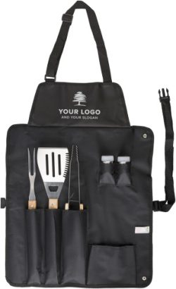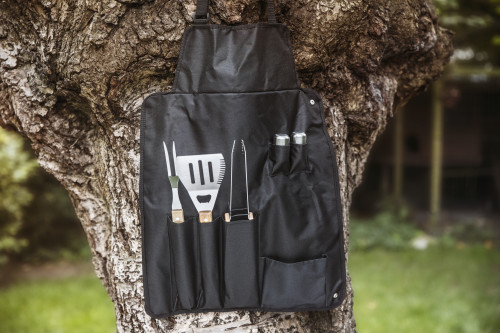 Najlonski predpasnik (600D) z nerjavečim jeklom, petdelni set za žar, ki vključuje: vilice za rezanje, lopatico, klešče ter set za sol in poper.