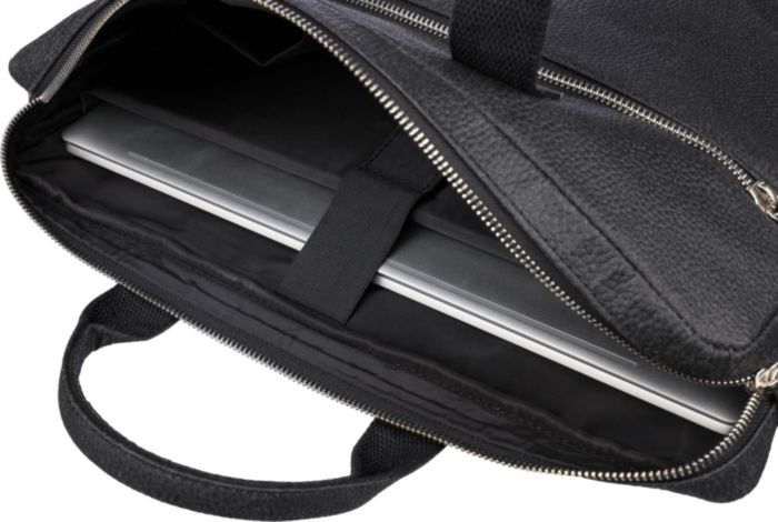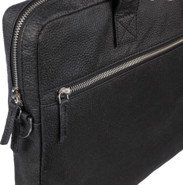 Torba za prenosnik  iz usnja z zadrgo na sprednji in zgornji strani ter oblazinjenim žepom za prenosnik. V notranjosti torbe  je več manjših žepov. Z nastavljivimi naramnicami.